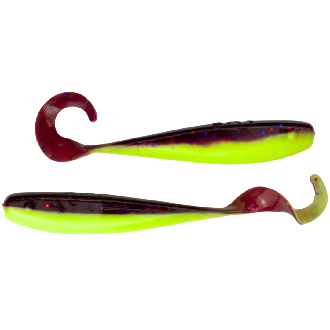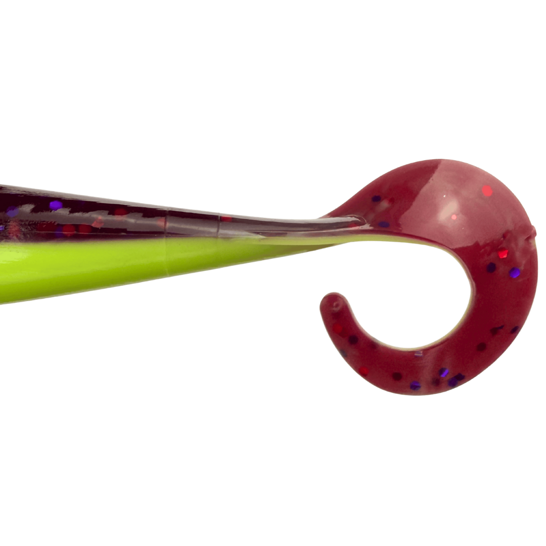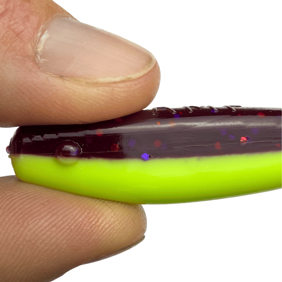 The OG, dark purple top with purple & red glitter over a chartreuse green glowing belly, great color for dirty water, another classic with our glowing garlicky twist!