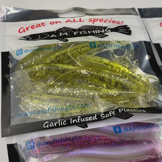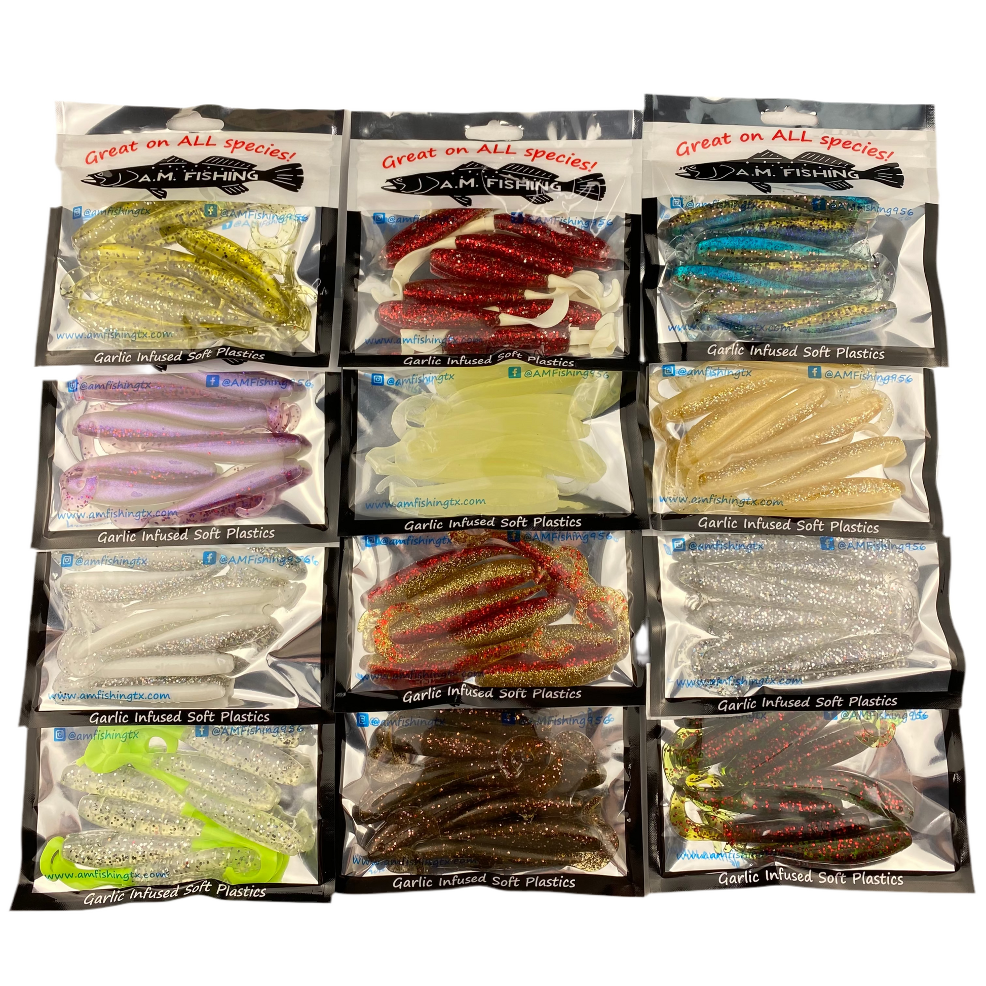 We sell 4 sizes in our curly tail jerkshads, 3", 4", 5.5" & 7"