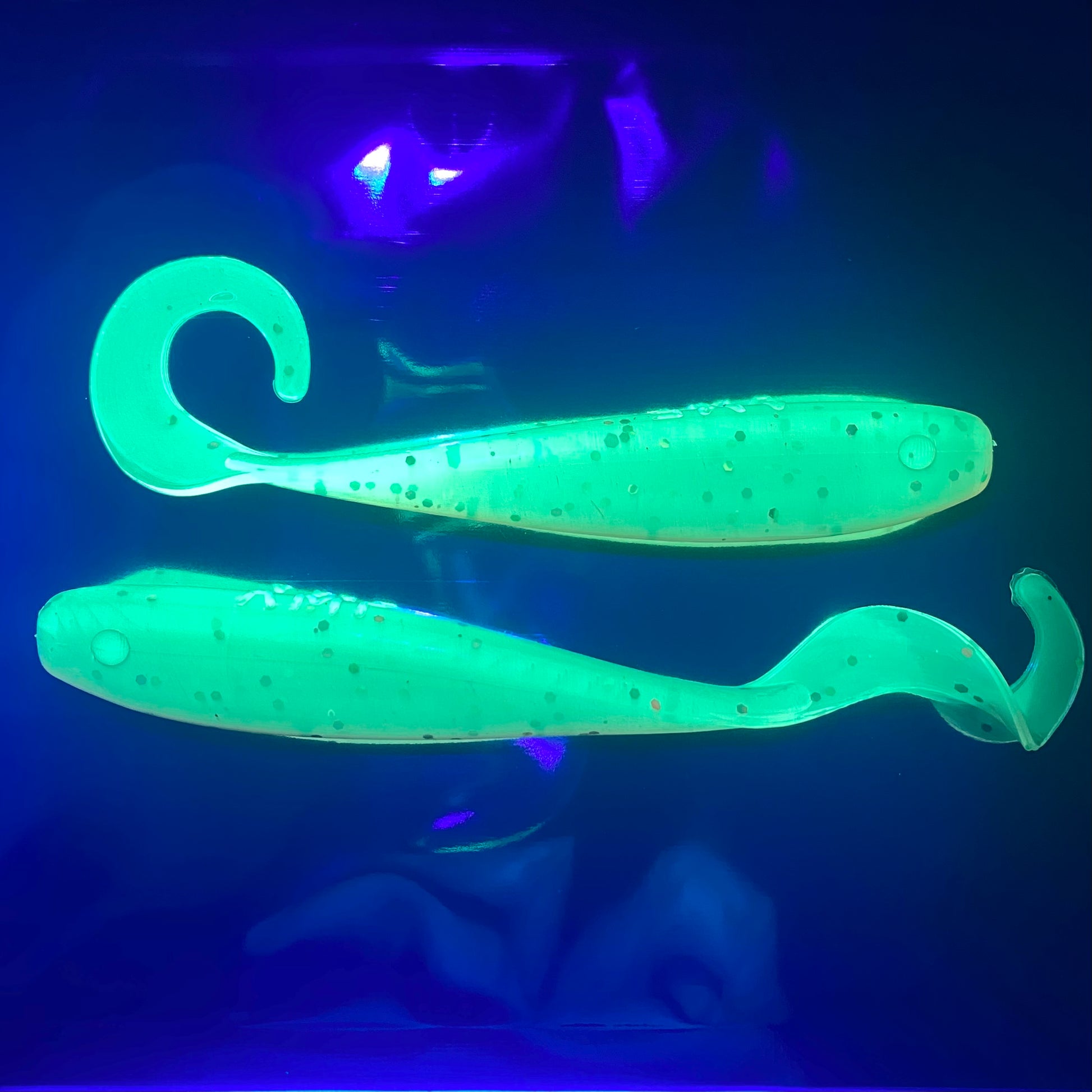 Bioluminescence (creatures producing light) is fairly common in the marine world, this is what our glowing colors are designed to imitate, just another little bonus to help you out in low light conditions. We also use pigments that reflect UV light rays from the sun, these travel further underwater than the rest of the light rays and fish can see them which means they can see the uv reflective lures form further away.