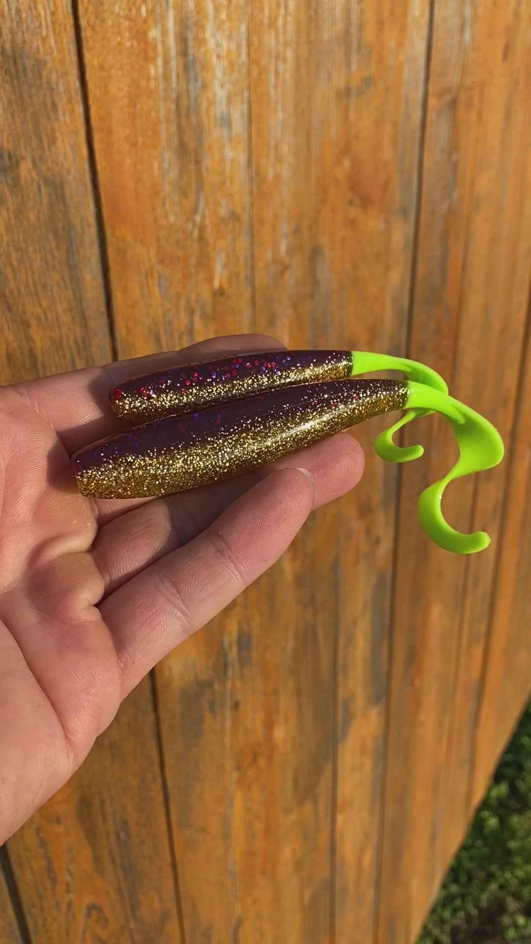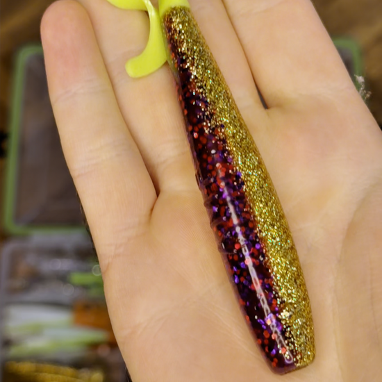 Dark Purple back with purple/red glitter, over gold glitter belly with a fluorescent chartreuse, green glowing tail, available in sizes 4" & 5.5"