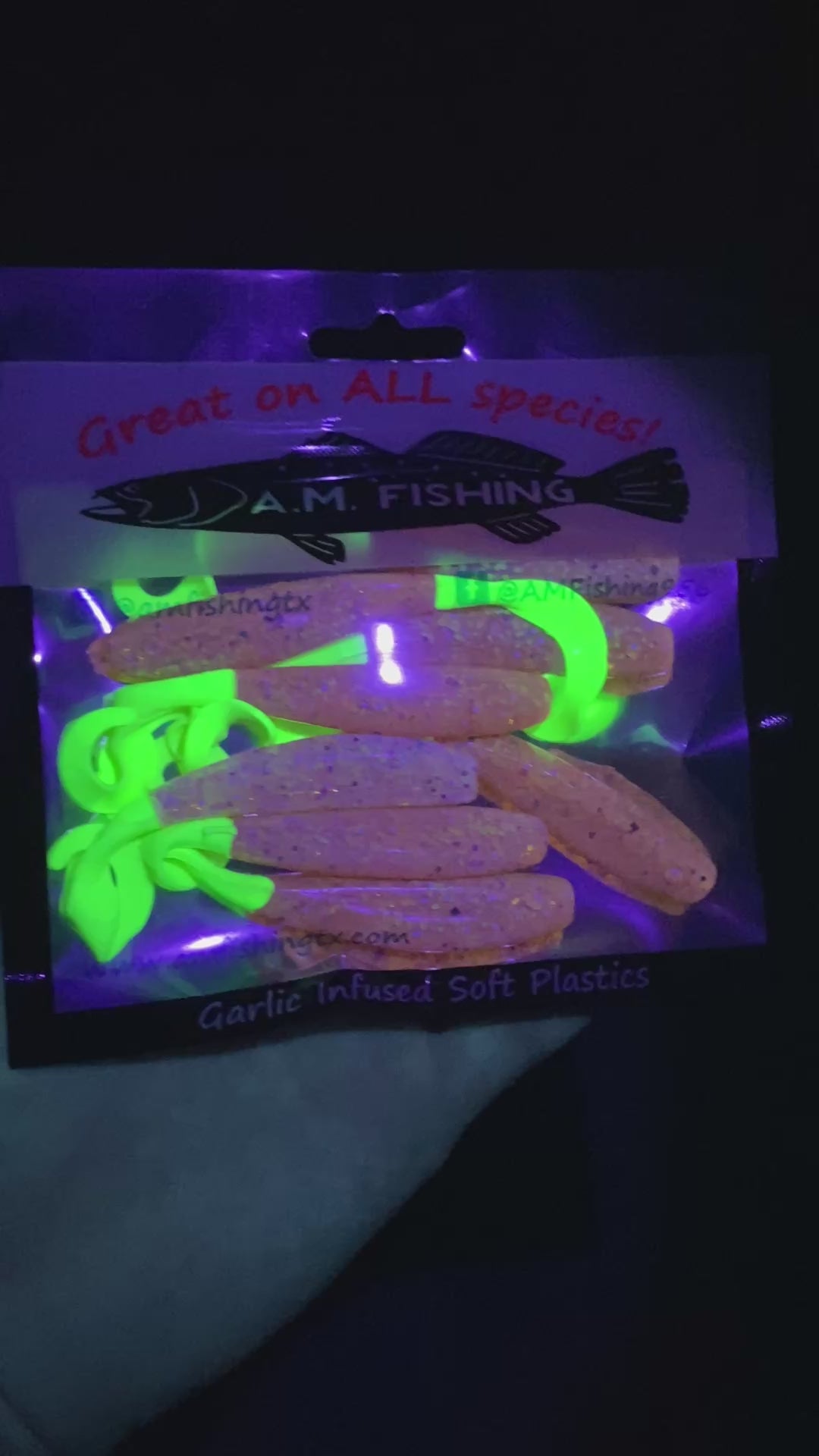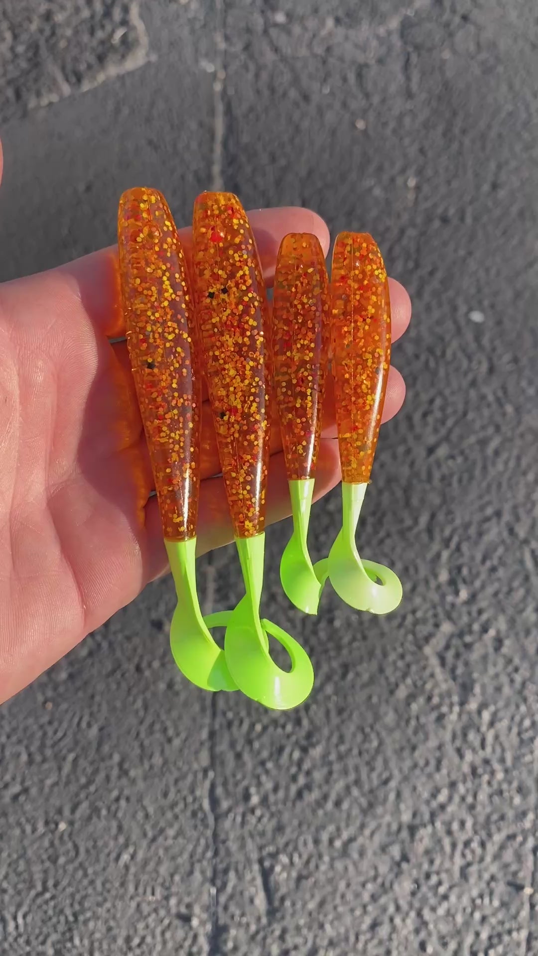 Fluorescent golden brown with yellow & orange glitter & a bright fluorescent glowing chartreuse tail, available in 4" & 5.5"